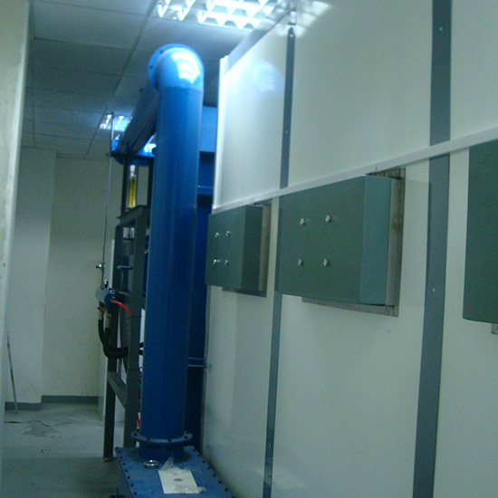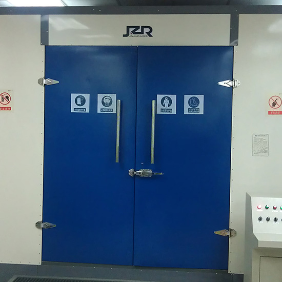 室 體?:室體外壁采用巖棉復(fù)合保溫板,內(nèi)部使用耐磨橡膠板,確保在噴砂過程中保護室體不受損壞。室體兩側(cè)設(shè)有對開式大門,頂部設(shè)有進風(fēng)百頁窗和消聲裝置?